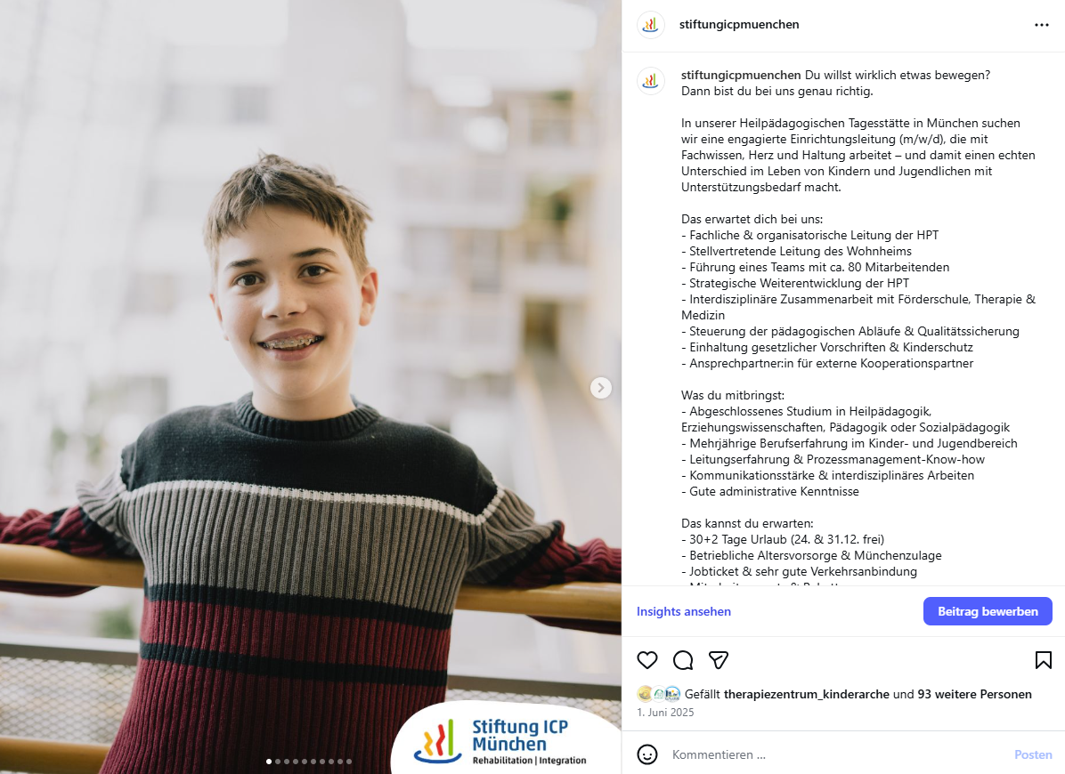 Bei der Stiftung ICP München stehen nicht nur Kinder, Jugendliche und Erwachsene, sondern auch unsere Mitarbeitenden im Mittelpunkt. Als großer sozialer Arbeitgeber bieten wir Ihnen ein wertschätzendes Arbeitsumfeld, in dem Professionalität, Teamgeist und persönliche Weiterentwicklung an erster Stelle stehen. Mit interdisziplinärer Zusammenarbeit, innovativen Ansätzen und attraktiven Benefits schaffen wir die besten Voraussetzungen für ein erfüllendes Arbeiten mit Menschen mit Behinderung. Bei uns erleben Sie jeden Tag, für wen und wofür Sie arbeiten und gestalten aktiv eine positive Zukunft – für andere und für sich selbst.